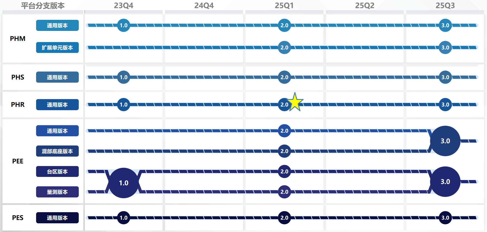 遵循电鸿整体路图规划,如图所示,本次发布的是PHR 2.0通用版本。版本发布的详细说明请参见《电鸿PHR(通用)版本发布详细说明》。