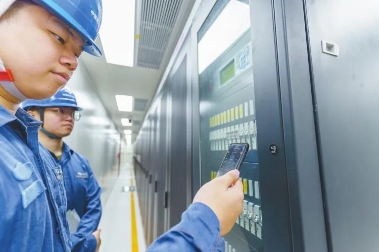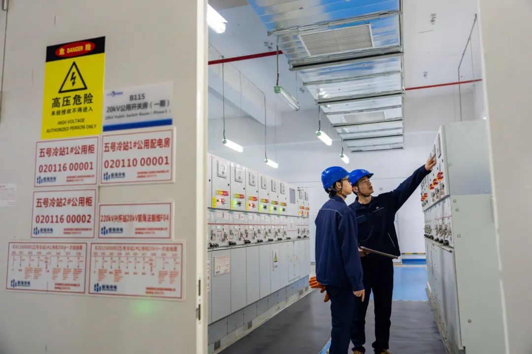 ▲深圳前海供电公司工作人员在前海5号冷站配电房检测设备运行情况。