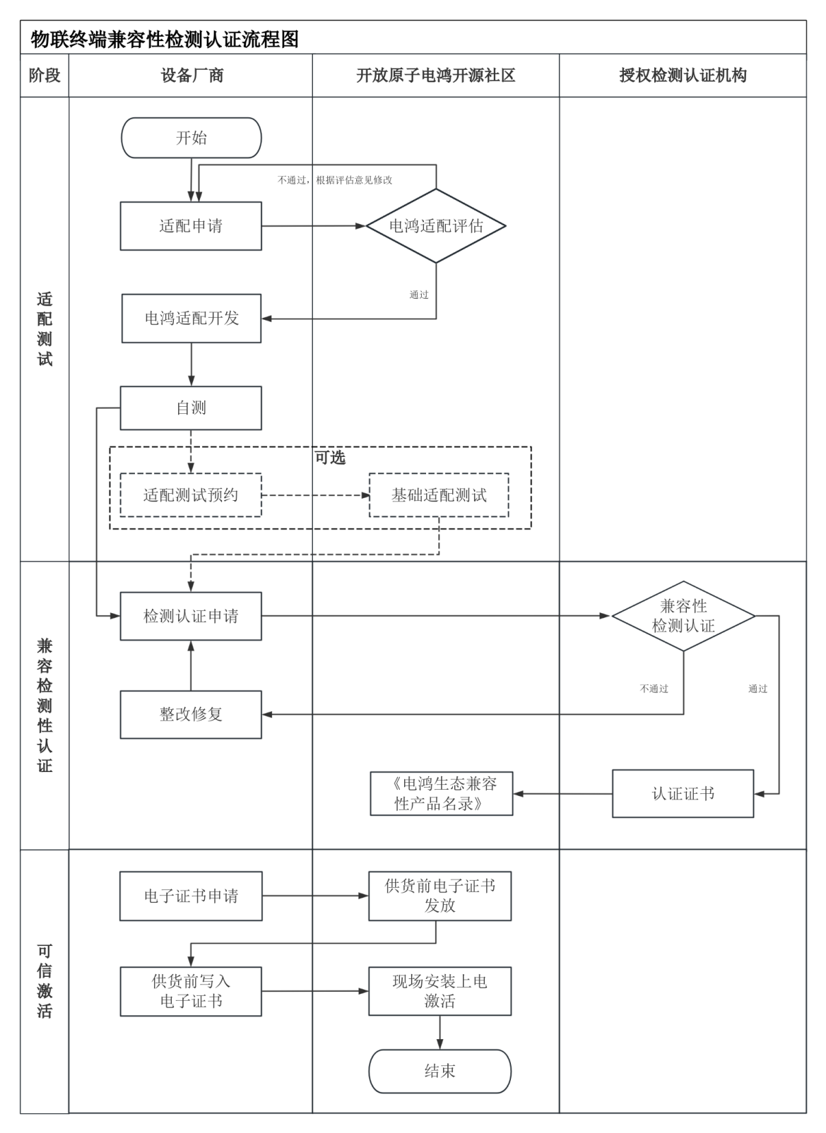 - 电鸿物联操作系统发布新的大版本后,生态厂商应按电鸿开源社区要求完成适配验证或重新检测认证,确保认证产品与新版本保持兼容。